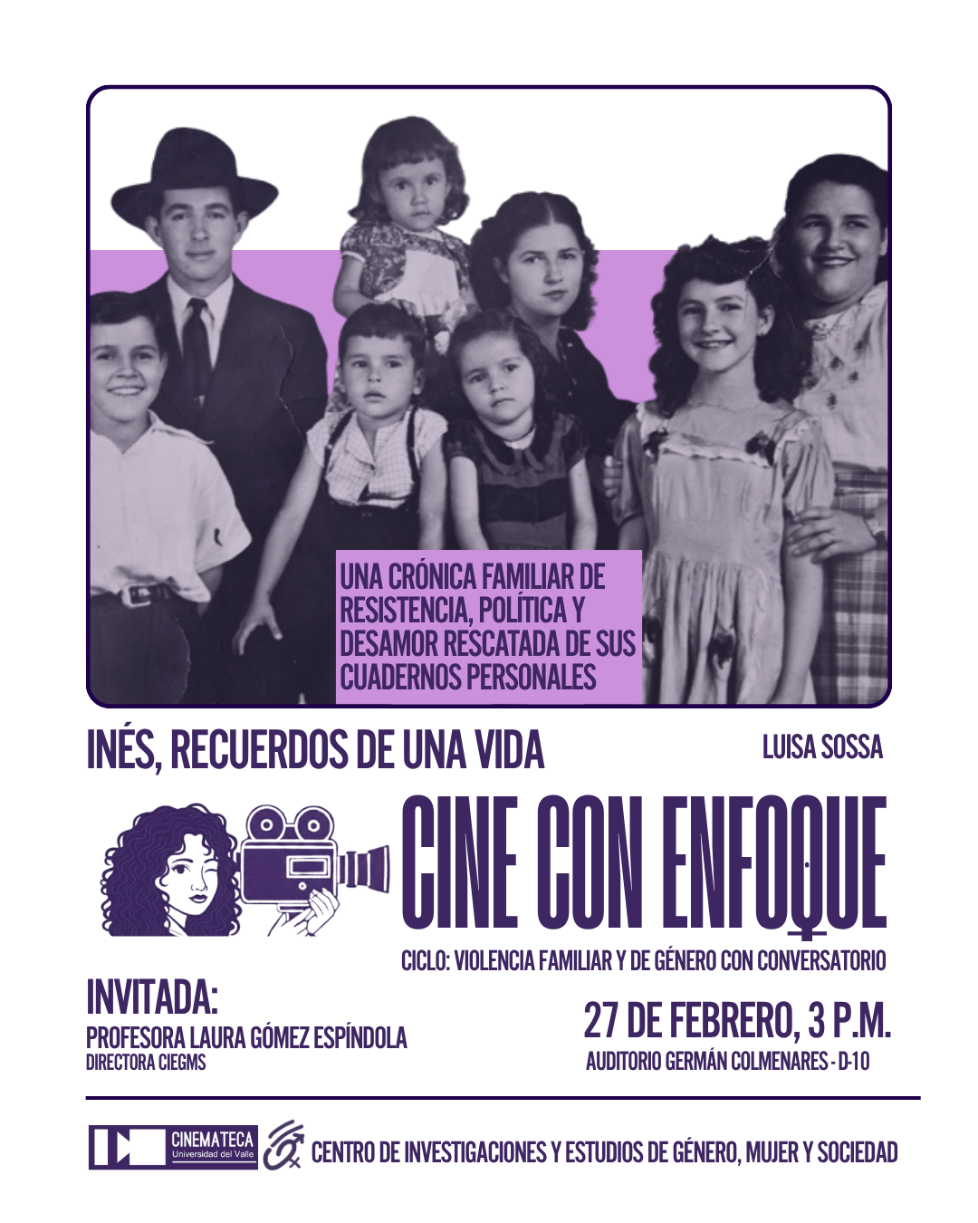 "Cine con Enfoque" es una estrategia del CIEGMS para visibilizar y generar reflexión en torno a las inequidades, discriminaciones y violencias basadas en género. Entendemos el arte como un lenguaje transformador y por ello a través de películas y documentales buscamos traer a la luz diferentes aspectos de la estructura patriarcal de nuestra sociedad que alimentan la injusticia y la inequidad, al tiempo que buscamos generar entre los participantes conciencia y compromisos de cambio que contribuyan a la construcción de una sociedad donde prime la equidad social y de género.