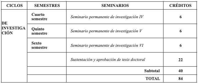Seminarios permanentes de investigación. Los seis seminarios de investigación se harán con la participación de los grupos de investigación que participan en el doctorado. Los tres primeros seminarios se focalizan en la formulación del proyecto de investigación y los tres últimos en el desarrollo de la tesis como tal. La evaluación de los primeros está a cargo del profesor tutor y la de los últimos a cargo del profesor director.